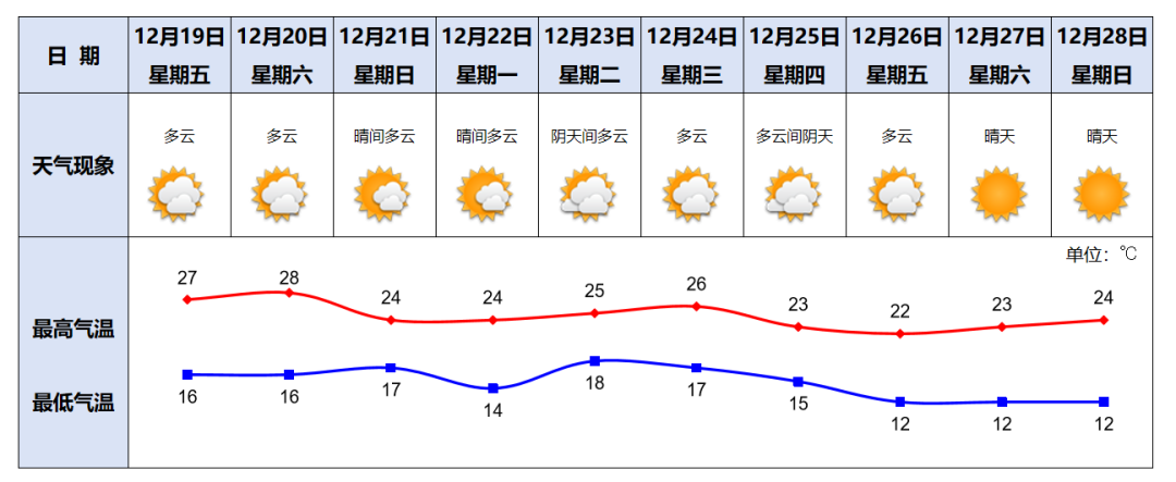 12月19日多云,16~27℃,相对湿度45%~60%;20日多云,16~28℃;21日晴间多云,17~24℃。(荔湾区气象台12月18日17时发布)